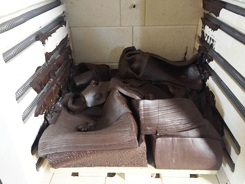La foto que os mostramos a continuación es lo que ocurre cuando cueces una pieza de barro rojo, de terracota, en alta temperatura. Como si fuera un flan, el barro no aguanta el excesivo choque térmico y se ondula como el chocolate. En este caso se ha deformado tanto que ha llegado a caer sobre las resistencias, un auténtico drama para el horno. El coste de la reparación del horno, en este caso, es casi tanto como el de un horno nuevo.