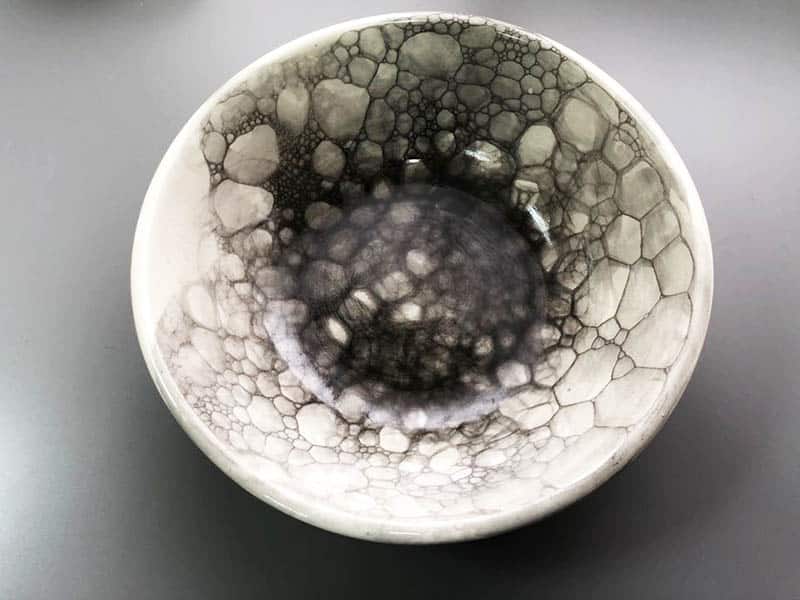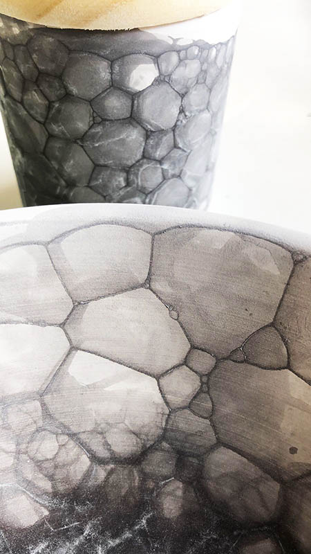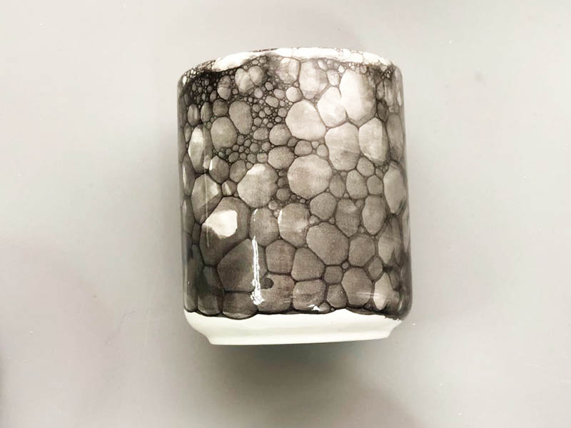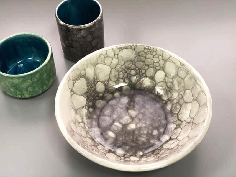 Se trata de crear burbujas o pompas con el esmalte, de tal forma que al posarse sobre la pieza en bizcocho, se queden transferidas. Con un acabado muy sutil, el efecto de las burbujas genera una trama continua sobre la pieza de cerámica.