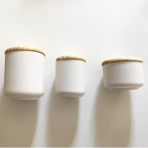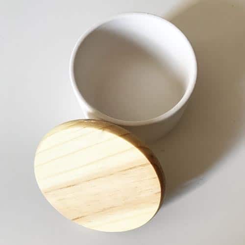 Escogemos una pieza de cerámica bizcochada que nos guste. Idealmente, si tiene una parte cóncava o plana, las burbujas se colocarán mejor. Nosotros hemos escogido unos botes con tapa de madera que decoraremos con esmalte de pompas por la parte exterior y un bol también perfecto para decorar su interior.