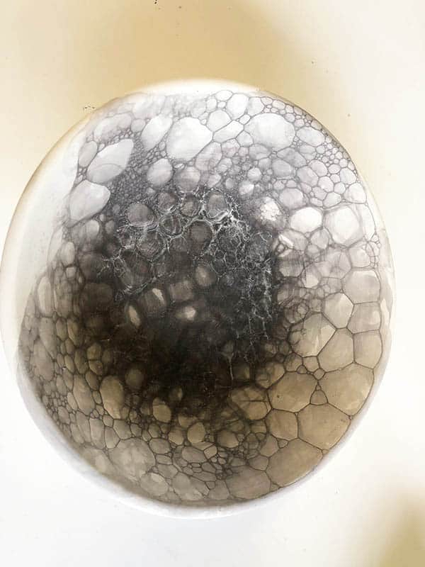 Ponemos la pieza sobre una torneta, para acceder con facilidad a las paredes exteriores. Ponemos el vaso de plástico con la mezcla muy cerca de la pieza y con ayuda de una pajita de plástico, comenzamos a soplar suavemente, para crear las pompas de jabón con color que se irán posando sobre la pieza.