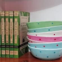 Revistas de AD, flores secas por doquier y un maravilloso manual sobre porcelana Japonesa, ponen el marco a su cerámica. Piezas utilitarias de colores mates y otras geométricas, lámparas, platos, jarrones, teteras, bandejas…