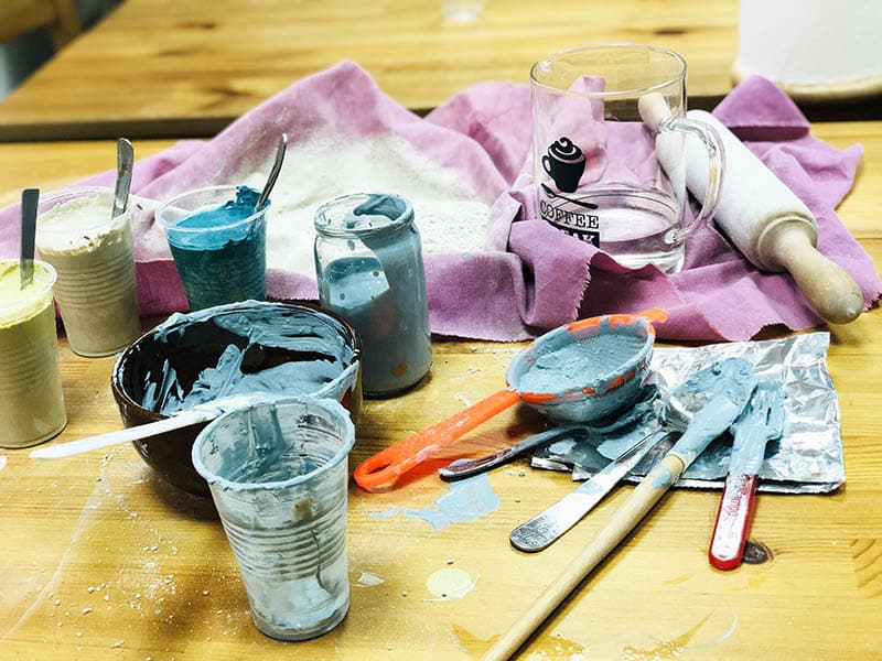 Con ayuda de un rodillo de madera o un martillo, molemos bien. Si ponemos el barro entre un trozo de tela evitaremos que los pequeños trozos de barro salgan de golpe hacia el exterior. El polvo en suspensión será menos molesto también.