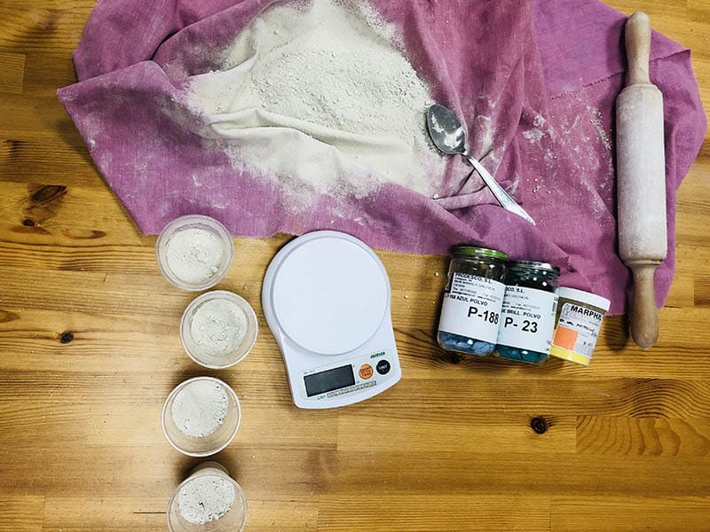 A continuación añadimos el color. Pesaremos entre un 5 y un 10% de óxido (sobre 100 gramos de base), dependiendo de la intensidad de color que estemos buscando.