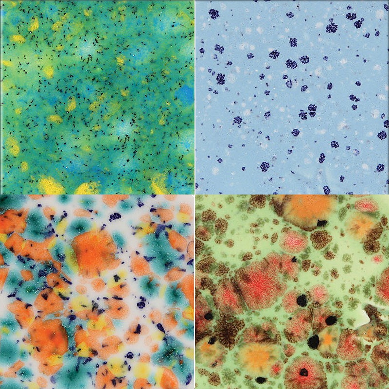 En baja temperatura, encontramos marcas como Mayco, Duncan, Botz, que realizan esmaltes con efectos, moteados, con cristales y craquelados.