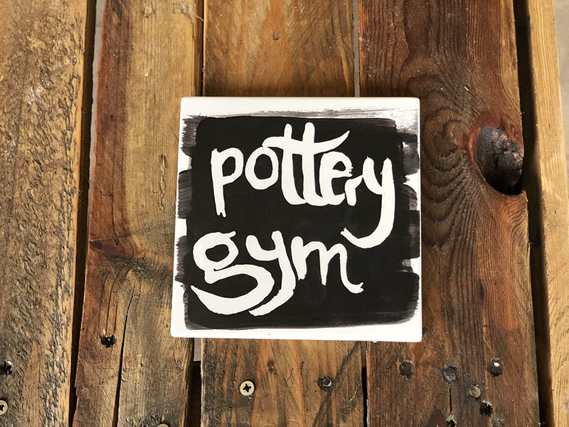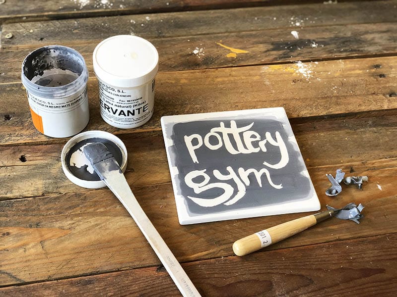 Cogemos una baldosa bizcochada y con ayuda de una brocha pequeña, que impregnamos con reservante de látex, escribimos una frase. Nuestra frase es nuestro estudio, PotteryGym.