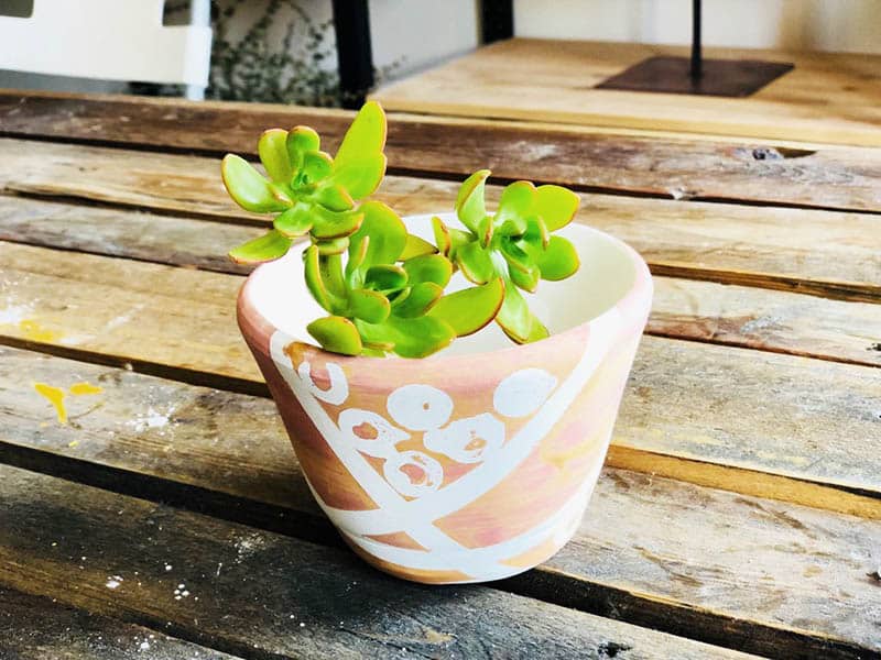Hemos utilizado una maceta de nuestro catálogo de piezas bizcochadas y hemos creado un efecto de líneas enrollando la cinta a lo largo y ancho de la pieza.