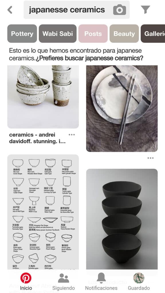Es importante conocer a tu audiencia. Y por otro lado, investigar en la propia red social. Así si buscas la palabra cerámica, verás que Pinterest te ofrece otros resultados como “cerámica artística”, “cerámica ideas”, “cerámica fría”, etc. Son los resultados más buscados por los usuarios.