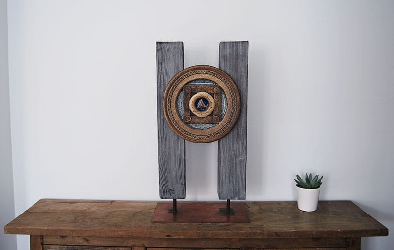 «Mi obra actual está centrada en la simbología ancestral”, explica siempre con sonrisa. “Hay que saber muchas profesiones para hacer cerámica”, cuenta mientras nos enseña su espacio en PotteryGym, una gran mesa donde monta también sus piezas de cerámica con madera y metal.