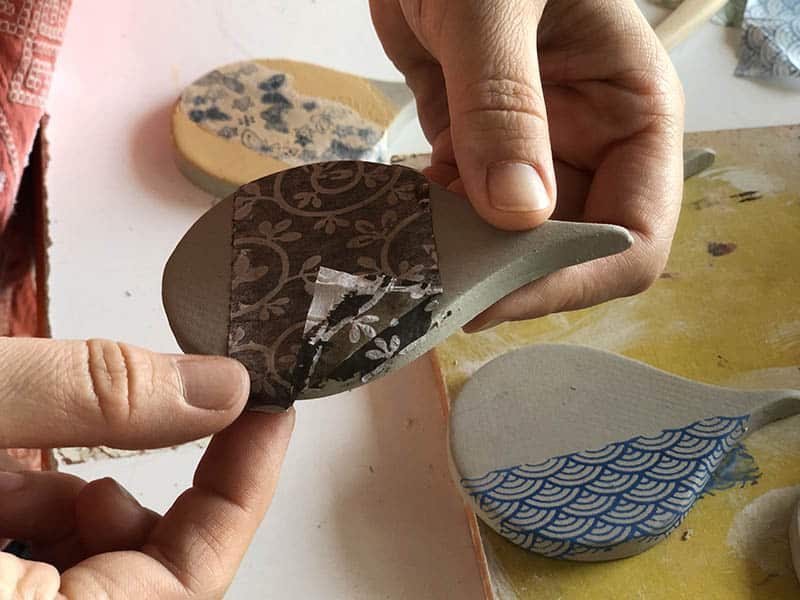 Humedecemos levemente la zona de arcilla donde vamos a colocar el papel y ponemos la parte con más color sobre la pieza, boca abajo. Boca arriba tendremos que ver la zona del papel que tiene menos intensidad de color.