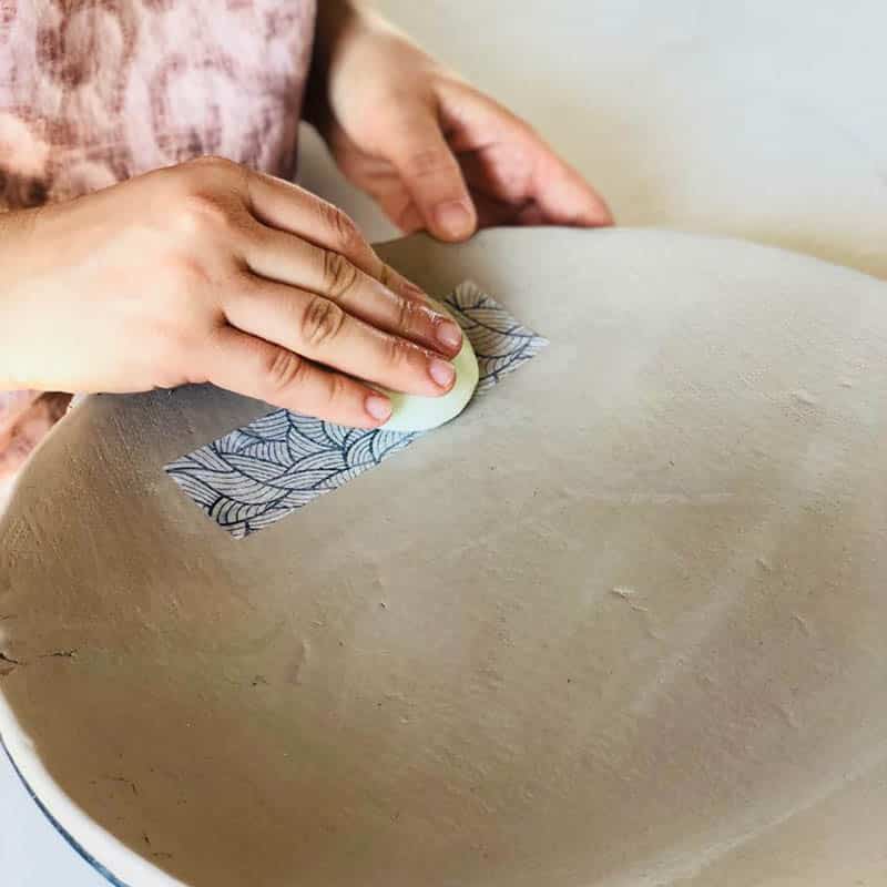 Para nuestro tutorial hemos decidido utilizar el Tissue Transfer sobre piezas crudas. La diferencia es que el soporte ya tiene humedad. Si estuviera bizcochada, tendríamos que humedecer un poco más la base antes de poner el papel.