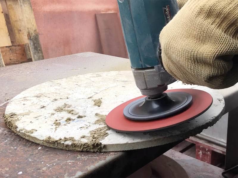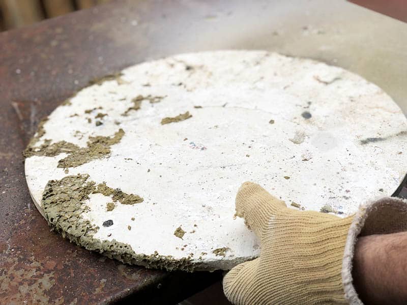 A continuación, ponemos en marcha la lijadora de disco. Con paciencia y un poco de tiempo, vamos arrancando y puliendo nuestra placa de horno. Sin llegar al material de la placa, eliminando los restos de impurezas que no forman parte de ella.